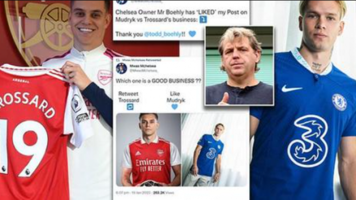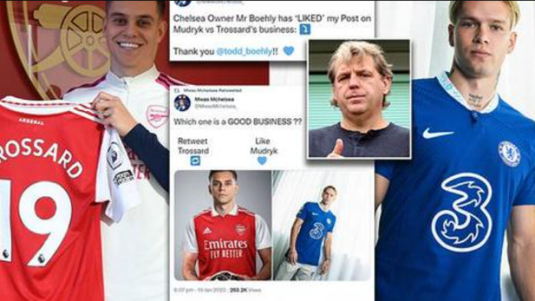 Pronari i Chelseat, Todd Boehly, ka bërë një reagim në një postim në Twitter për të pohuar se klubi i tij ka bërë biznes më të mirë se Arsenali duke nënshkruar me Mykhailo Mudryk, ndërsa Topçinjtë morën Leandro Trossard.