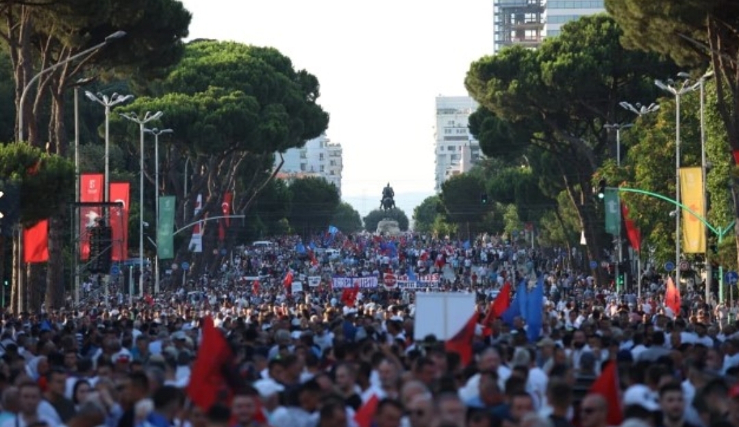 Qytetarët e mbledhur në protestë, mbajnë pankarta kundër qeverisë në duar, ndërsa në kor vijojnë thirrjet ‘E duam Shqipërinë si gjithë Europa’.