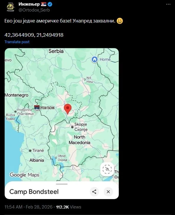 E faqe të ndryshme të serbëve në rrjete sociale, raportojnë se shumë serbë po ua dërgojnë shërbimeve të ndryshme të Iranit koordinatat e kampit ushtarak Bondsteel në Kosovë.