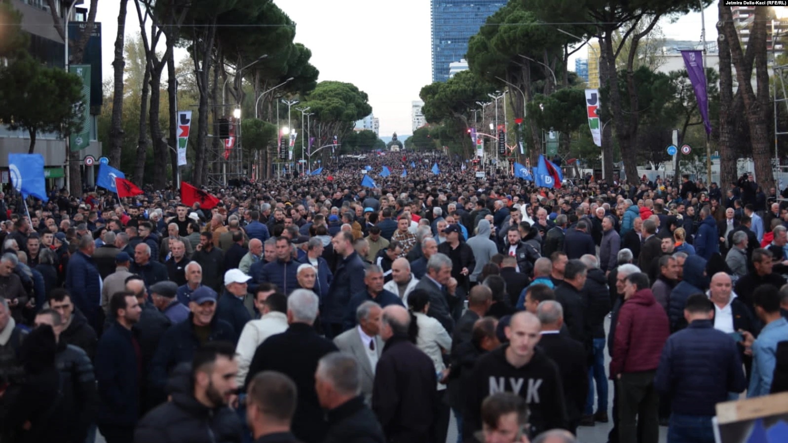 Qytetarë të shumtë janë mbledhur para kryeministrisë në Shqipëri në protestën e thirrur nga opozita kundër Qeverisë së kryeministrit Edi Rama.