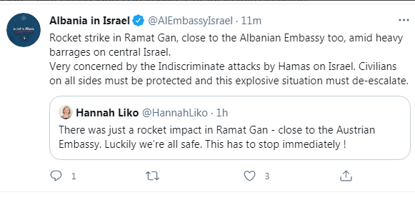 Ambasada Shqiptare atje me anë të një statusi në median sociale Twitter, bën me dije shqetësimin nga “sulmet pa kriter të Hamasit në Izrael”.