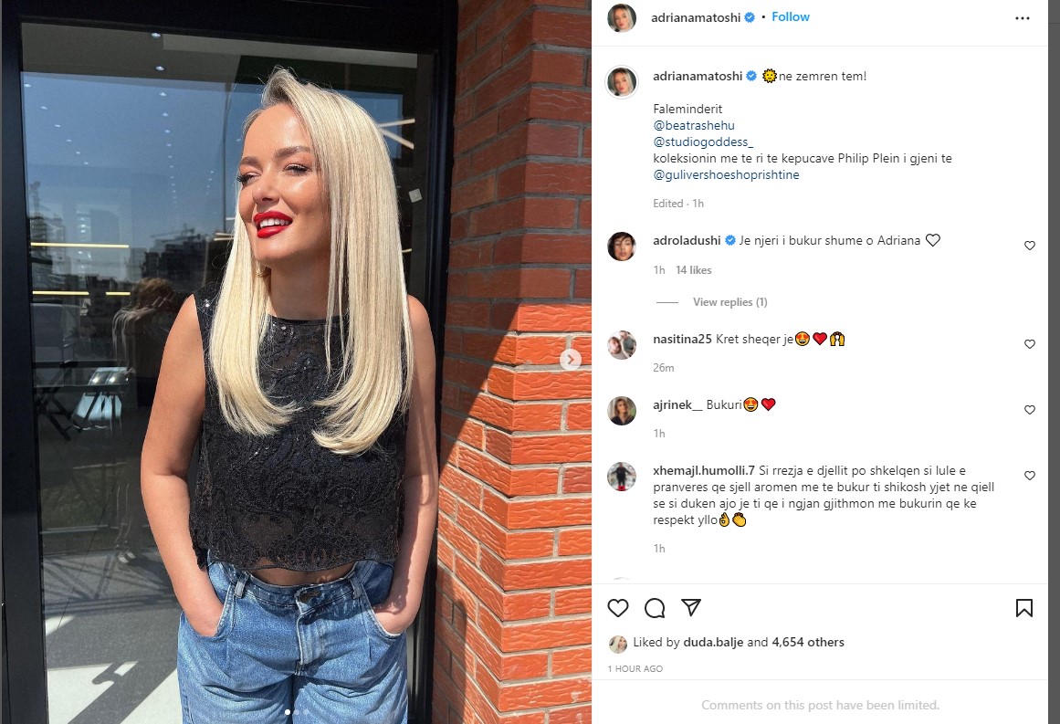 Në anën tjetër për ndarjen nuk ka folur ende aktorja Adriana Matoshi, por e njëjta ka publikuar disa fotografi në Instagram ku duket më tërheqëse se kurrë.