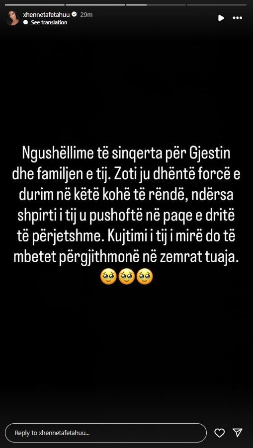 Në mesazhin e parë, Xheneta shkruan: “Ngushëllime të sinqerta për Gjestin dhe familjen e tij. Zoti ju dhëntë forcë e durim në këtë kohë të rëndë, ndërsa shpirti i tij u pushoftë në paqe e dritë të përjetshme. Kujtimi i tij i mirë do të mbetet përgjithmonë në zemrat tuaja”.