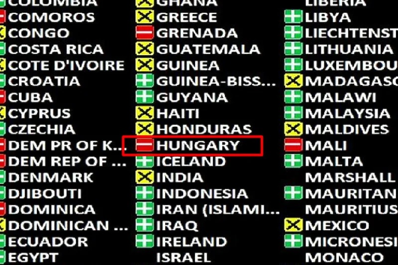 Antigua, Bjellorusia, Kina, Komoret, Kuba, Koreja e Veriut, Kongo, Dominika, Eritrea, Eswatini, Grenada, Hungaria, Mali, Nikaragua, Nauru, Rusia, Sao Tome, Serbia dhe Siria.
