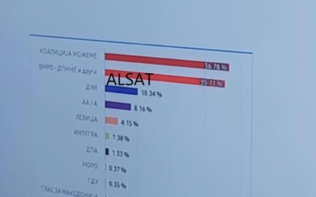 Alsat mëson se nga përpunimi i rezultateve në 2,274 vendvotime deri në ora 23:00, respektivisht nga rreth 60 për qind e vendvotimeve prin koalicioni “Mundemi” i udhëhequr nga LSDM-ja prin me 36.78 për qind, VMRO-DPMNE me 35.71 për qind, BDI me 10.34 për qind, dhe koalicioni ASH- Alternativa me 8.16 për qind. Partia e Majta ka 4.15 për qind, Integra 1.38 për qind dhe PDSH 1.33 për qind.