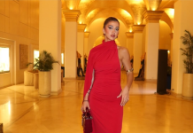 Ajo qe e veshur në një kostum në ngjyrë të kuqe të zjarrtë, kombinim i cili i ngjante shumë.