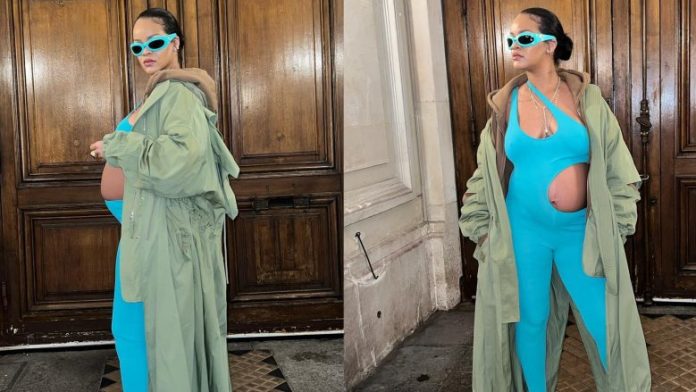 Rihanna, e cila është në pritje të fëmijës së saj të parë me ASAP Rocky, vuri në pah barkun e rrumbullakosur në një trupore me ngjyrë të kaltër.