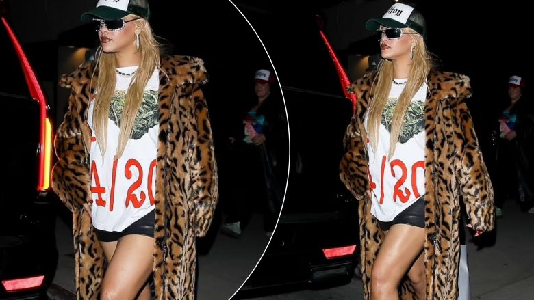 Këngëtarja 36 vjeçe, veshi një minifund prej lëkure të zezë me një bluzë të gjerë që shfaq një grafik kanabisi dhe datën 4/20 të shkruar me numra të mëdhenj të kuq, shkruan DailyMail.