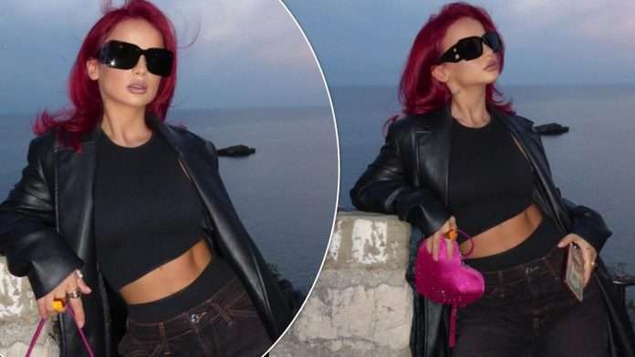 Një pallto të gjatë lëkure kombinuar me bluzë të shkurtër dhe xhinse ndërsa në dorë mbante një çantë në formë zemre ngjyrë rozë.