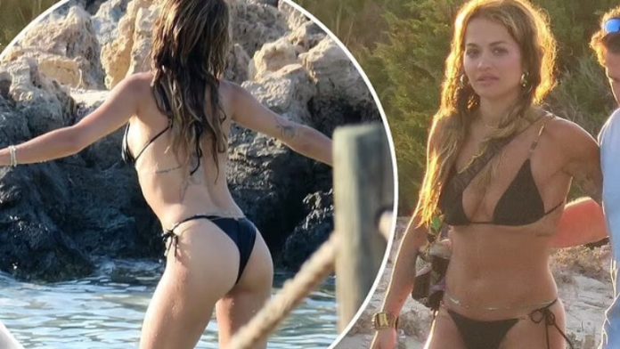 Rita dukej fenomenale me bikini të zeza në stil tanga që nxirrnin në pah fizikun e saj dhe aksesorët me një zinxhir barku dhe një palë vathë të artë, shkruan DailyMail.
