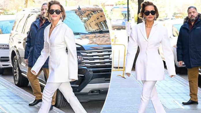 Këngëtarja Rita Ora, 33 vjeçe, dukej mahnitëse në daljen e saj teksa veshi një xhaketë të madhe të përshtatshme dhe një kostum të bardhë elegant.