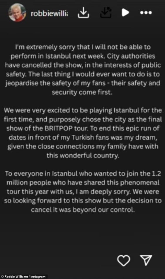 Williams shprehu keqardhje për fansat turq, duke theksuar se kishte dashur ta mbyllte turneun pikërisht në Stamboll, një qytet me të cilin ka lidhje familjare përmes bashkëshortes së tij, Ayda Field, e cila është me prejardhje turke.