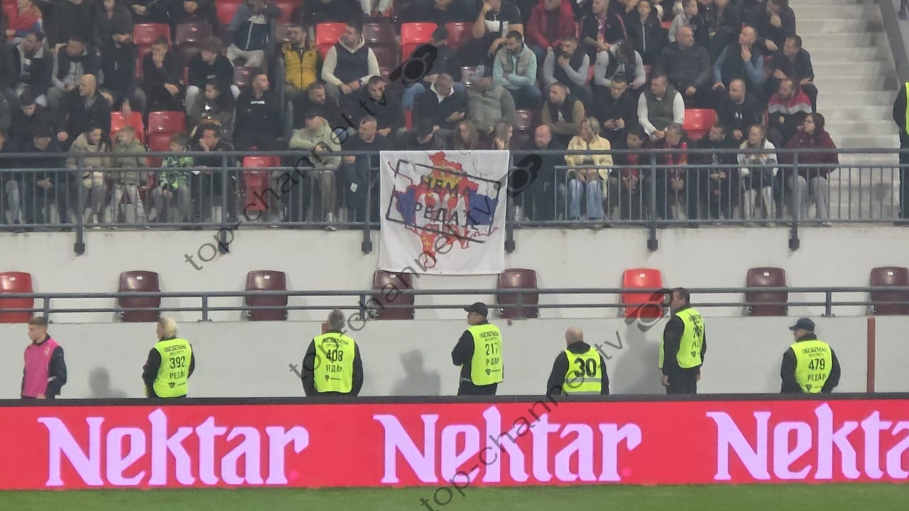 70’ Kanë mbetur edhe 20 minuta lojë në stadiumin e Leskovcit ku Shqipëria po vazhdon ta ketë akoma epërsinë e pjesës së parë. Ndërkohë, serbët po vazhdojnë të bëjnë thirrje racizëm teksa ‘TopChannel’ ka siguruar fotografi ku në stadium është shfaqur baneri ‘Kosova është Serbi’.