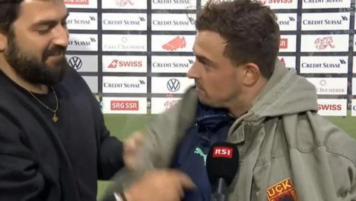 “Episodi i pakëndshëm në fund të ndeshjes në Zvicër: Tifozi hyn në fushatë gjatë intervistave dhe ia vendos Xherdan Shaqirit një xhaketë.