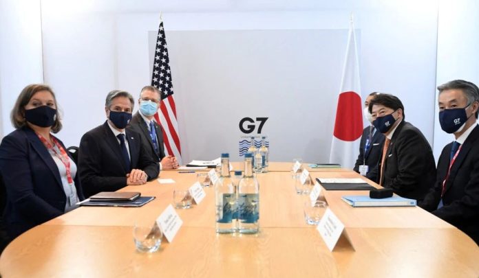 Kryediplomatët Hayashi dhe Blinken zhvilluan bisedime ndërsa marrin pjesë në takimin e ministrave të jashtëm të G7-ës në qytetin anglez të Liverpulit.