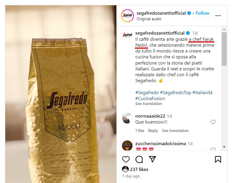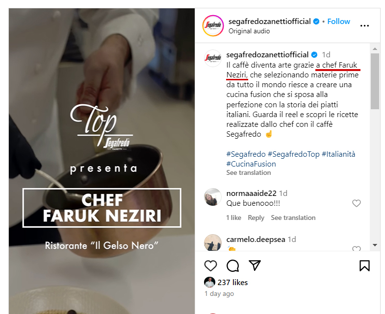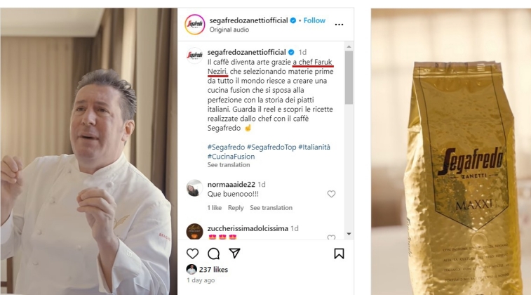 Shefi i kuzhinës italiane me famë ndërkombëtare z.Faruk Neziri, pas shumë sukseseve në arenën ndërkombëtare në këtë sferë, së fundmi nga brendi i njohur botëror i caffe Segafredo, është shpallë Ambasador. Kjo mirënjohje dhe ky Çmim i rëndësishëm për Faruk Nezirin ka pasuar, pas disa mirënjohje dhe çmimeve tjera të rëndësishme gjatë viteve të fundit.