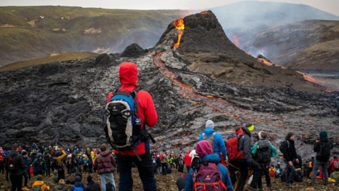 Disa njerëz janë mbledhur për të parë nga afër shpërthimin e një vullkani pranë kryeqytetit të Islandës Reykjavik.