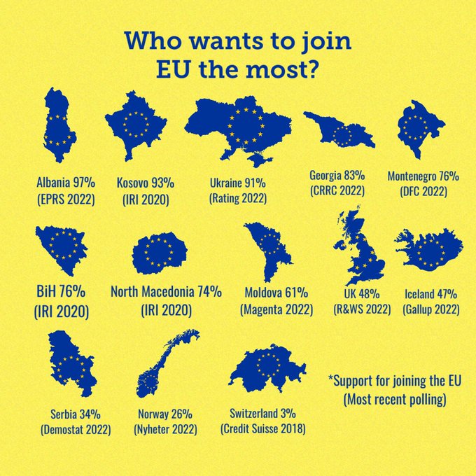 Vendi që e dëshiron më së shumti anëtarësimin në Bashkimin Evropian është Shqipëria, sipas një grafik-u të publikuar nga Tom Moylan, këshilltar për komunikim në Komisionin Evropian.