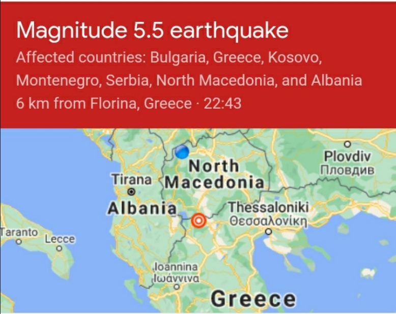 Shtatë shtete dridhen nga tërmeti! January 9, 2022 Share Facebook Twitter Pinterest WhatsApp Linkedin ReddIt Email Print Telegram VK LINE Viber Tërmeti në lartësi prej 5.5 ballë është ndjerë në shtatë shtete. Epiqendra e tërmetit që ishte në detin Adriatik apo në Florina të Greqisë, është ndjerë në Maqedoninë e Veriut, Shqipëri, Kosovë, Serbi, Mal të Zi dhe Bullgari, transmeton TV21. ARTIKUJ TË NGJASHËMMË SHUMË NGA AUTORI Maqedoni Taravari reagon për sulmin ndaj futbollistëve në Prilep: Duket makth, por fatkeqësisht është realitet Lajme Zv/ministri Iseni: Policia ka identifikuar dhe ndaluar personin që shkaktoi incidentin në ndeshjen KF Haraçina-KF Pobeda Lajme KSHZ: Deri në orën 20:00 kanë votuar 3.327 nga gjithsej 4.826 persona të sëmurë ose të paaftë