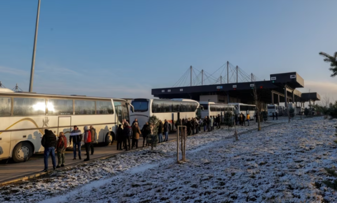 Një grup serbësh nga Kosova duke shkuar në një qendër votimi në qytetin jugor serb të Rashkës, afër kufirit me Kosovën, më 17 dhjetor 2023, gjatë zgjedhjeve parlamentare dhe lokale në Serbi.
