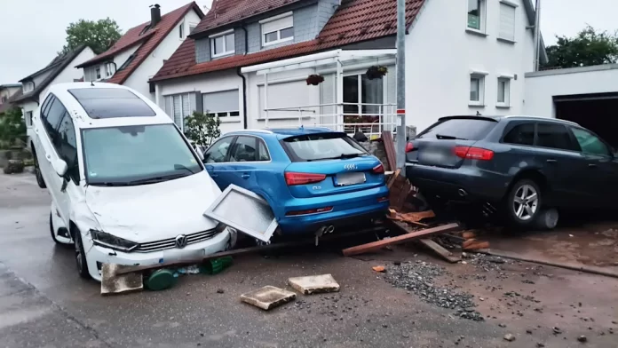 Makinat u grumbulluan njëra mbi tjetrën në Miedelsbach (Ba.-Wü.) nga forca e masave të ujit