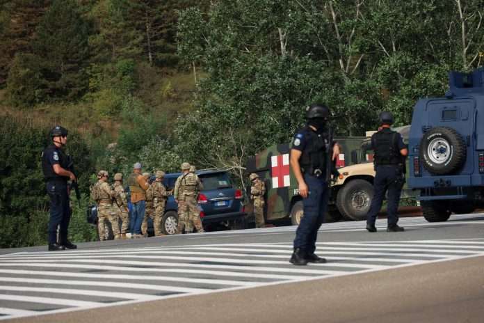 People work as Kosovo police and U.S. and EU troops stand by after one police officer was killed, another hurt in Kosovo gunfire, in Josevik, Kosovo September 24, 2023. REUTERS/Fatos Bytyci