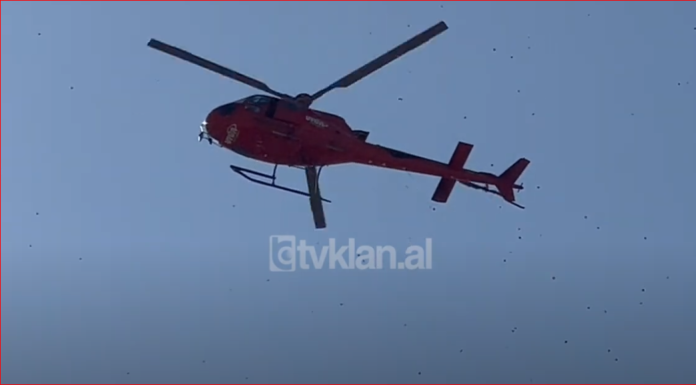 Një çift nga Fieri ka zgjedhur për ta bërë më të veçantë dasmën e tyre të marrin një helikopter, i cili ka hedhur petale trëndafilash të kuq në sheshin kryesor të qytetit ku kalojnë dasmorët me makina.