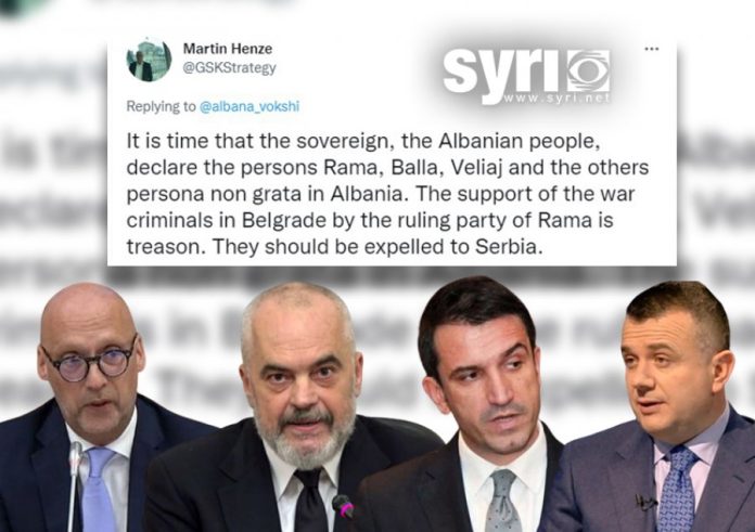 Ndërsa më pas, në një postim në Twitter eksperti gjerman kërkon të shpallen non grata në Shqipëri, kryeministri Edi Rama, kryetari i grupit parlamentar të PS, Taulant Balla dhe kryebashkiaku i Tiranës, Erion Veliaj.