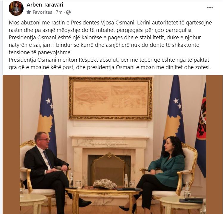 “Mos abuzoni me rastin e Presidentes Vjosa Osmani. Lërini autoritetet të qartësojnë rastin dhe pa asnjë mëdyshje do të mbahet përgjegjësi për çdo parregullsi. Presidentja Osmani është një kalorëse e paqes dhe e stabilitetit, duke e njohur natyrën e saj, jam i bindur se kurrë dhe asnjëherë nuk do donte të shkaktonte tensione të panevojshme. Presidentja Osmani meriton Respekt absolut, për më tepër që është nga të paktat gra që e mbajnë këtë post, dhe presidentja Osmani e mban me dinjitet dhe zotësi”, ka shkruar Taravari.