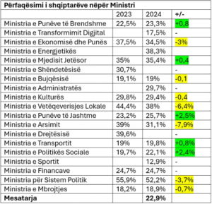 Të dhënat e raportit të Avokatit të Popullit tregojnë se përfaqësimi i shqiptarëve gjatë vitit 2024 është rritur për 0,6% në krahasim me vitin paraprak. Respektivisht prej 21,7 në 22,3%. Megjithatë numrat i referohen periudhës kur ishte në fuqi Balancuesi i cili u shfuqizua në tetor të vitit 2024.