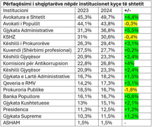 (TABELA 2) Bindja se shqiptarët përfaqësohen denjësisht ose mbi kuotën 25%, vetëm kur në pozitat udhëheqëse të institucioneve janë shqiptarë mbase mund të përforcohet edhe nëse i shohim të dhënat për Avokatin e Popullit, Avokatin e Shtetit, Gjykatën Administrative, KSHZ Kuvend, Qeveri e të tjerë.