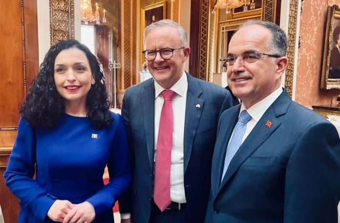 Presidentja e Kosovës, Vjosa Osmani, gjatë qëndrimit në Londër për kurorëzimin e Mbretit Charles III, është takuar me kryeministrin e Australisë, Anthony Albanese.