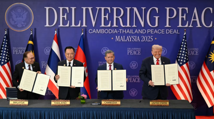 Në një ceremoni me udhëheqësit tajlandez dhe kamboxhian përpara një sfondi të mbuluar me simbolet e SHBA-së dhe fjalët “Delivering Peace”, Trump, i cili e ka paraqitur veten si ndërmjetës global të paqes, tha se marrëveshja demonstron përkushtimin e administratës së tij për paqe “në çdo rajon ku mund ta arrijmë”.