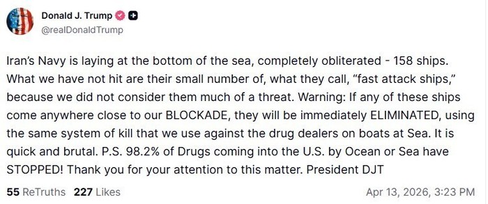 Presidenti amerikan ka postuar në Truth Social, duke thënë edhe një herë se marina e Iranit është “shuar plotësisht” përpara se të vazhdojë të lëshojë një paralajmërim në lidhje me bllokadën.
