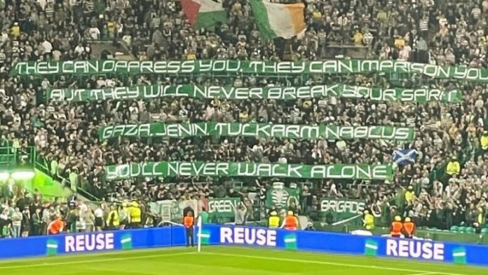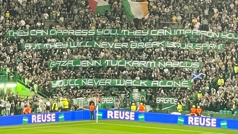 Tifozët e Celtic nuk heqin dorë nga mbështetja e tyre më e fortë e mundshme për Palestinën në kohë të vështira. Nga ndeshja në ndeshje ata shpallin slogane kushtuar popullit palestinez pranë flamujve të këtij vendi, e kështu ishte edhe mbrëmë në ndeshjen e Ligës së Kampionëve.