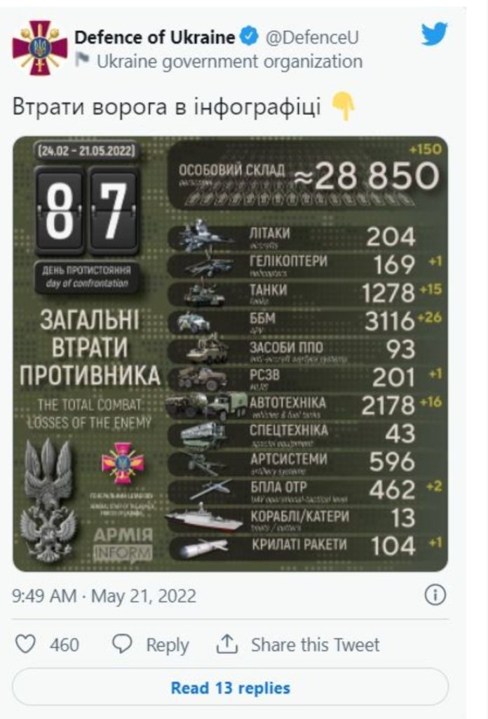 Tutje në njoftim thuhet se Rusia që nga fillimi i luftës më 24 shkurt, ka humbur 204 avionë, më shumë se 1,200 tanke dhe rreth 28,000 luftarakë.