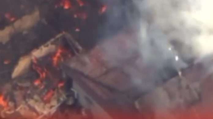 Pamjet e filmuara nga ajri shfaqin momentin kur nga shpërthimi i fuqishëm, ngritet në qiell një top i madh i zjarrit i pasuar nga disa shpërthime tjera më të vogla.