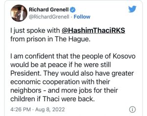 “Unë sapo fola me Hashim Thaçin nga burgu i Hagës”, ka shkruar Grenell.