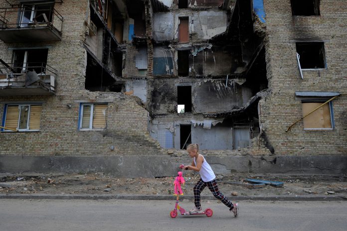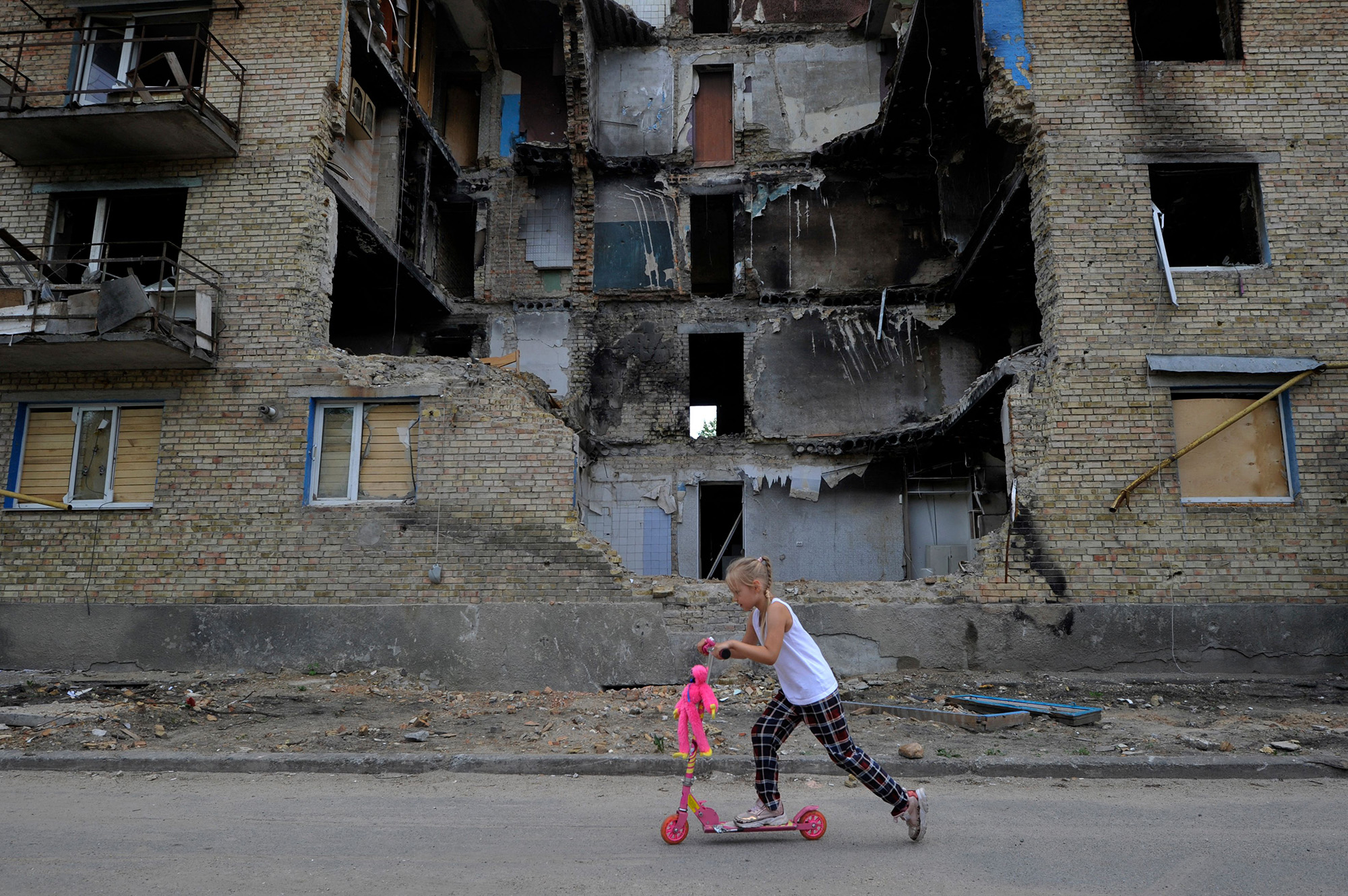 TOPSHOT - A girl rides a kick scooter past a destroyed residential building in the village of Horenka, Kyiv region, on June 4, 2022 amid the Russian invasion of Ukraine. (Photo by Sergei CHUZAVKOV / AFP) (Photo by SERGEI CHUZAVKOV/AFP via Getty Images)