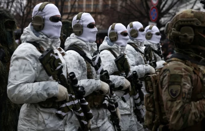 “Pjesëtarë të Forcës së Sigurisë së Kosovës marshojnë në paradën e festimeve të 18-vjetorit të pavarësisë së Kosovës”, është përshkrimi i “Sky News” për këtë fotografi të shkrepur nga agjencia “Reuters”.