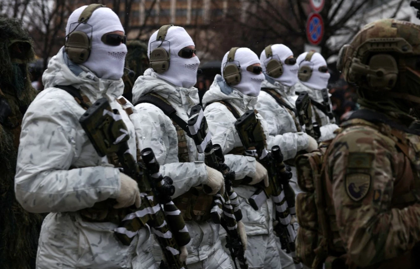 Fotografia shfaq disa snajperistë me uniforma të bardha.