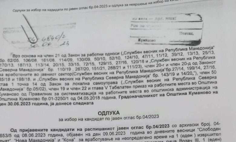 Komuna e Kumanovës ka punësuar katër maqedonas në vendet e parapara për shqiptarë. Katër të punësuarit kanë deklaruar rrejshëm se i përkasin përkatësisë etnike shqiptare dhe kanë zënë vendet e punës. Në konkurs ishin paraparë katër shqiptarë në pozitat: shofer, kamarier, pastrues dhe mirëmbajtës. Në vendin e katër shqiptarëve, përmes deklarimit të rrejshëm janë punësuar Nenad Dimovski, Dragan Veliçkovski, Igor Dimitrievski dhe Boban Stojanovski. Çdo vendim për punësim mban firmën e kreut të Kumanovës, Maksim Dimitrievski.