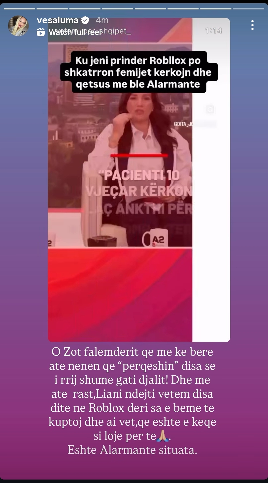 Në një postim në Instagram, Vesa ka ndarë një video ku flitet për ndikimin e kësaj loje dhe ka rrëfyer përvojën personale me djalin e saj, Lianin, i cili për disa ditë ishte bërë pjesë e botës virtuale të Roblox.