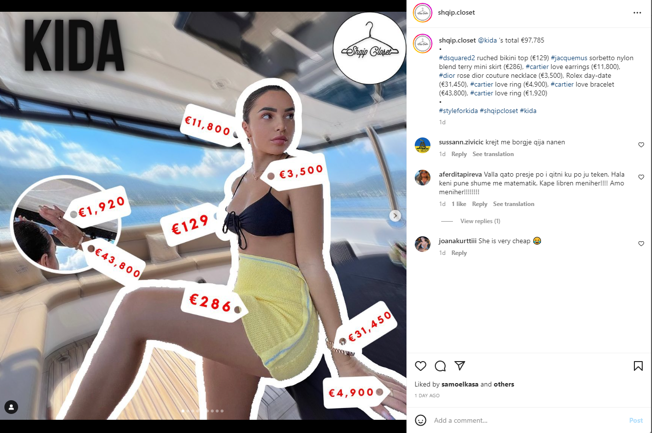 Së fundi, “Shqip Closet” i ka bërë një vlerësim dukjes së fundit të Kidës dhe në bazë të llogaritjeve del se vlera e saj në këtë foto kap shifrën e 97.785 euro.