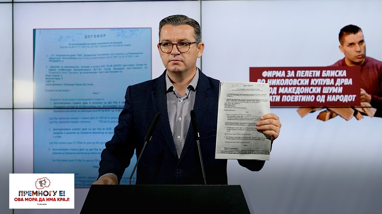 VMRO-DPMNE-ja sot ka akuzuar N.P. “Pyjet e Maqedonisë” për lidhje me një kompani për prodhimin e piletave, e që sipas tyre është e afërt me ministrin e Bujqësisë Ljupço Nikollovski, përcjell TV21. Cvetan Tripunovski nga VMRO-DPMNE tha se “Pyjet e Maqedonisë” i kanë ndihmuar kompanisë në fjalë që të ketë profit prej 3,5 milionë eurove, duke i shitur dru për 300 deri 525 denarë për m3, ndërsa ftoi Prokurorinë që të merret me rastin në fjalë.