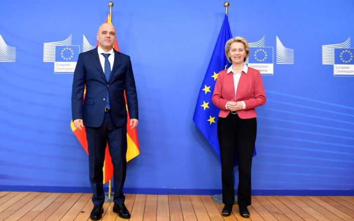 Kryeministri i Maqedonisë së Veriut, Dimitar Kovaçevski, së bashku me delegacionin qeveritar para pak çastesh mirëpritën me nderimet më të larta shtëtrore në Shkup, Kryetaren e Komisionit Evropian, Ursula Von der Layen.