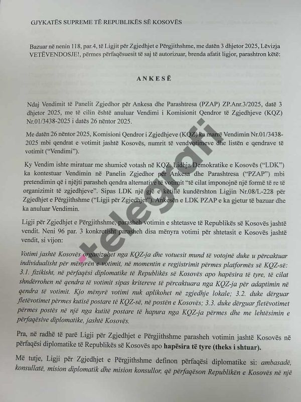Sipas ankesës, të cilën e ka siguruar Telegrafi, VV kërkon që Gjykata Supreme të anulojë vendimin e PZAP-it Nr. ZP.Anr.3/2025 të datës 1 dhjetor 2025 dhe të rikthejë në fuqi vendimin e Komisionit Qendror të Zgjedhjeve të miratuar më 26 nëntor 2025.