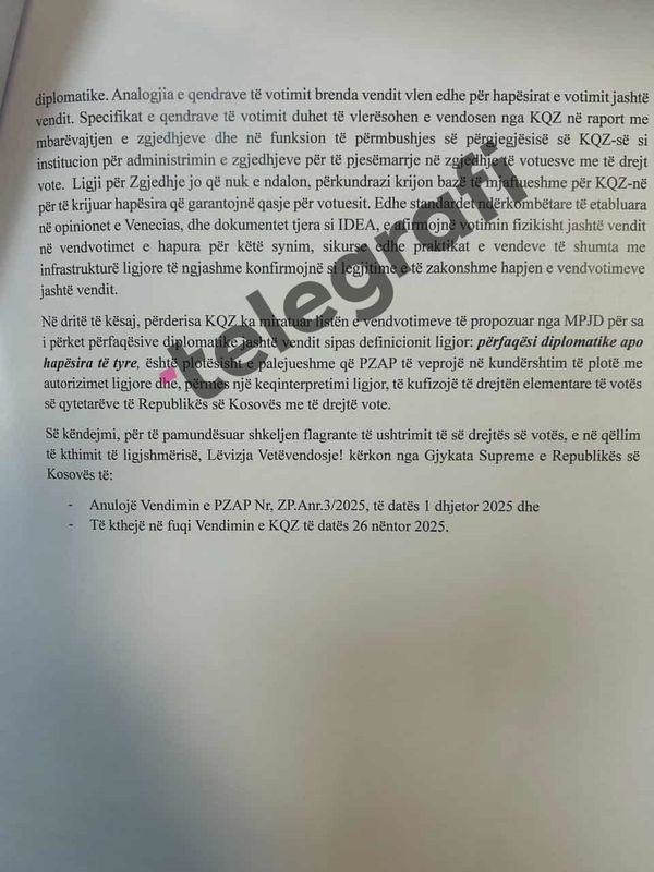 Në dokument thuhet se me 26 nëntor, KQZ-ja kishte miratuar vendimin që përcaktonte qendrat e votimit jashtë Kosovës, numrin e vendvotimeve dhe listën e hapësirave ku do të votohej në diasporë.