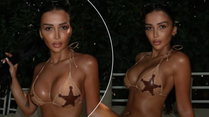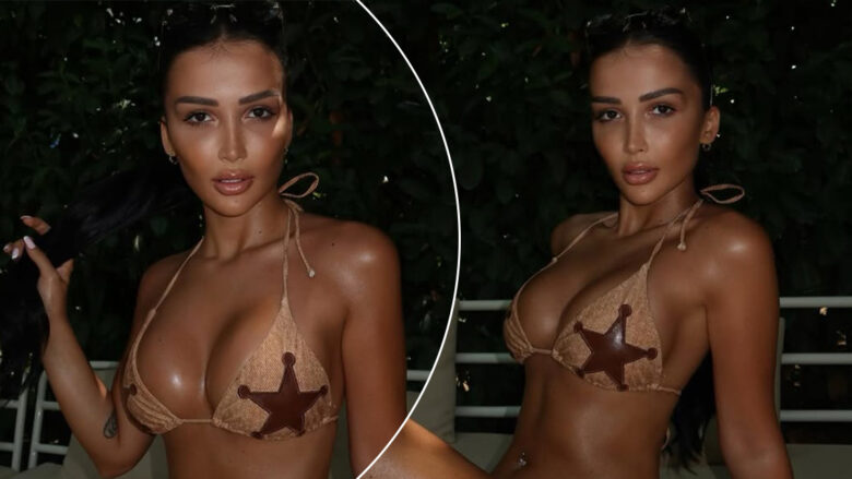 Në një set fotografish të realizuara në një ambient natyror me gjelbërim të dendur, Xheneta u shfaq e veshur me bikini në ngjyrë bezhë me teksturë cowboy, të dekoruara me simbole të sherifit, duke i dhënë pamjes së saj një frymë unike.