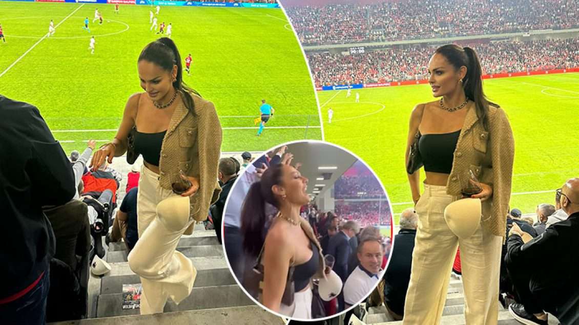 Ajo publikoi në rrjetin social Instagram disa fotografi dhe video, ku dukej mjaft atraktive e veshur me një palë pantallona dhe një bluzë të shkurtër, ndërsa jepte mbështetje për djemtë e Kombëtares Shqiptare.